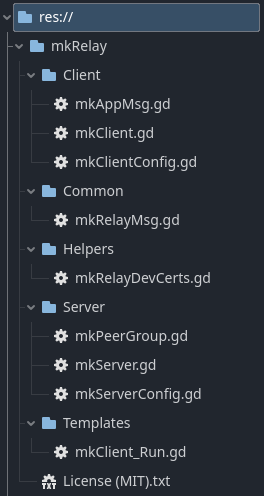 - Create a new Godot project, add the /mkRelay folder from the mkRelay_DevProject, delete the /Server subfolder. Add a node to the project and assign /mkRelay/Client/mkClient.gd.
