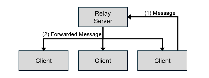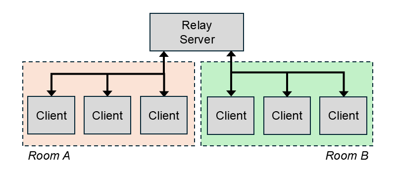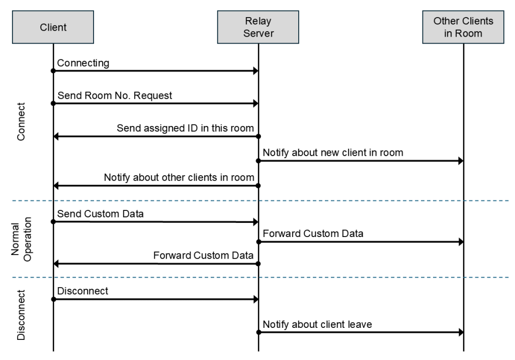 Then, during regular operation (a client is in a room), a custom bunch of bytes (the “client custom message to other clients”) would be sent to the server, given a short check there, and be distributed to all clients (again, of the room).